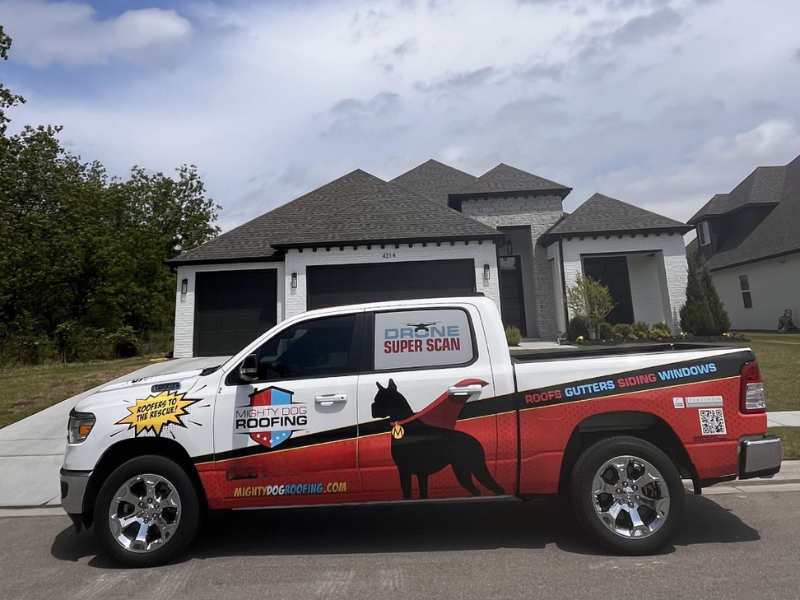 The Mighty Dog House Cape is a tarping system used by Mighty Dog Roofing Company to help keep the jobsite clean of debris and protect your landscaping and home. It is our commitment to you to keep your project site clean and safe for your family, our crews and team. Excellence in customer service is what we promise. Keeping those nails out of your lawnmowers tires can be accomplished with our Mighty House Cape. Your neighbors will appreciate the clean site as we complete your project.